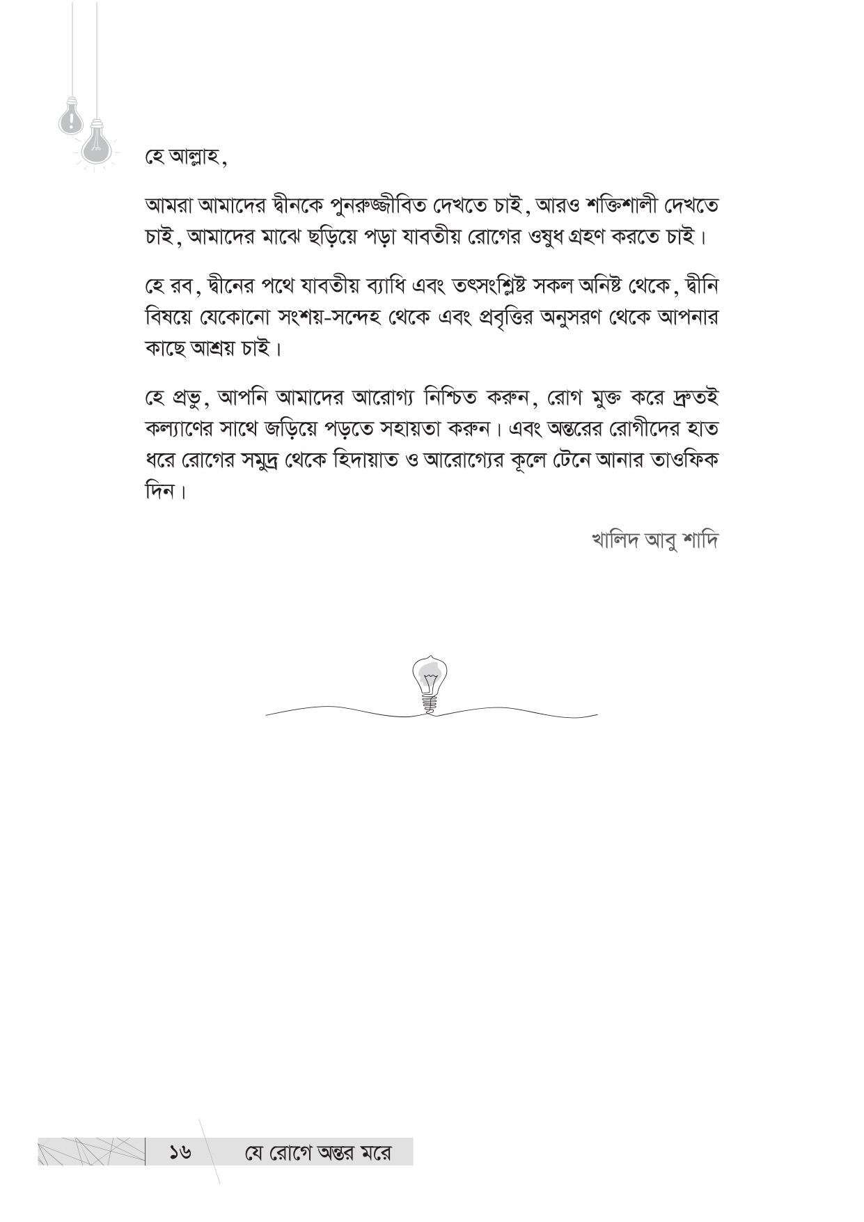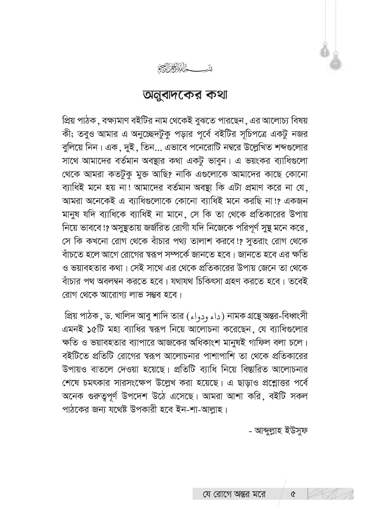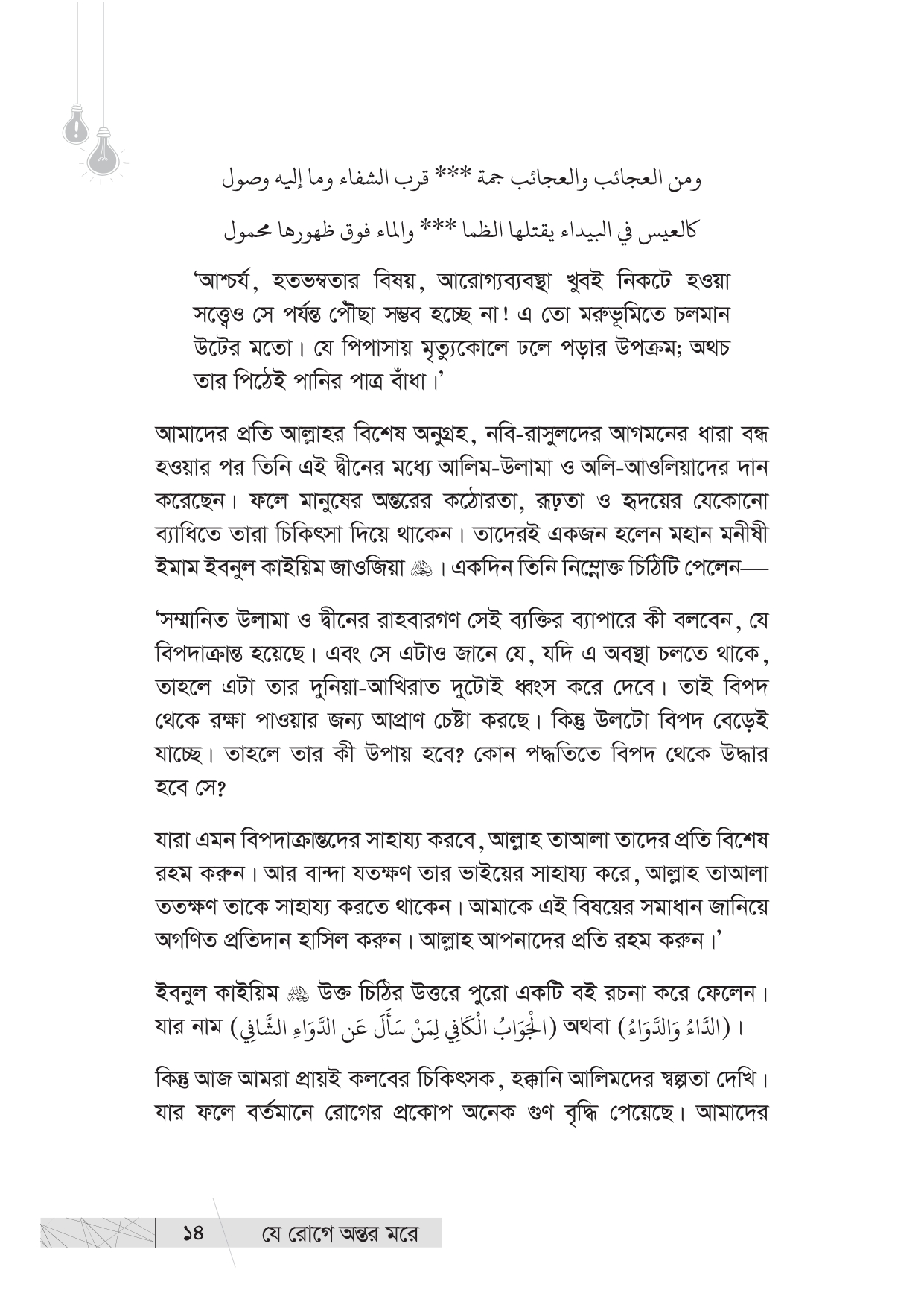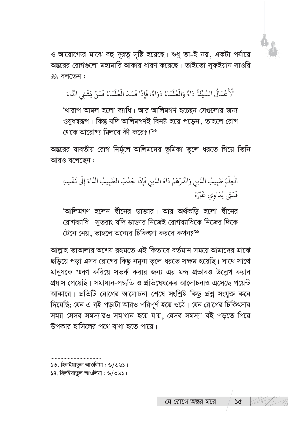 অতএব এ কথা স্পষ্ট যে, যতদিন পর্যন্ত ওহির দাওয়াখানার বাইরে ওষুধ খোঁজা হবে, ততদিন এসব রোগ থেকে মুক্তি পাওয়া সম্ভব হবে না; বরং সমস্যা আরও বড়ো হবে, আরও বিপজ্জনকভাবে বেড়ে যাবে।প্রিয় পাঠক, বক্ষ্যমাণ গ্রন্থে আপনি অন্তর-বিধ্বংসী এমনই ১৫টি মহা ব্যাধির স্বরূপ ও প্রতিকার সম্পর্কে জানতে পারবেন, যে ব্যাধিগুলোর ক্ষতি ও ভয়াবহতার ব্যাপারে আজকের অধিকাংশ মানুষই গাফিল বলা চলে।…