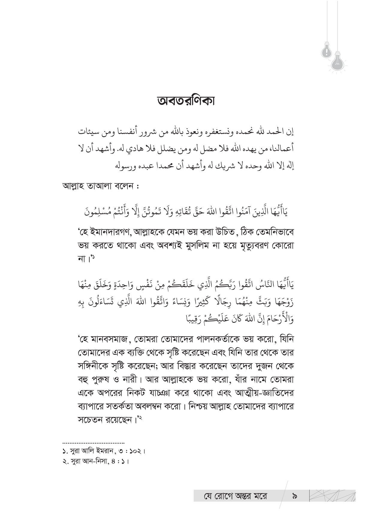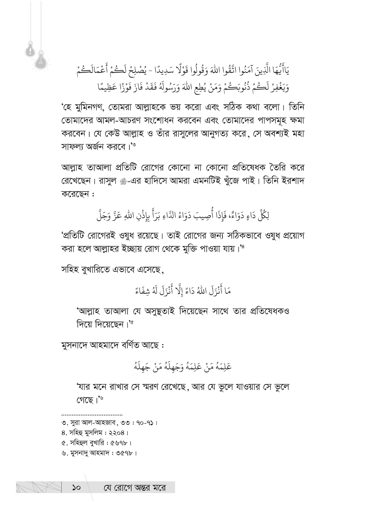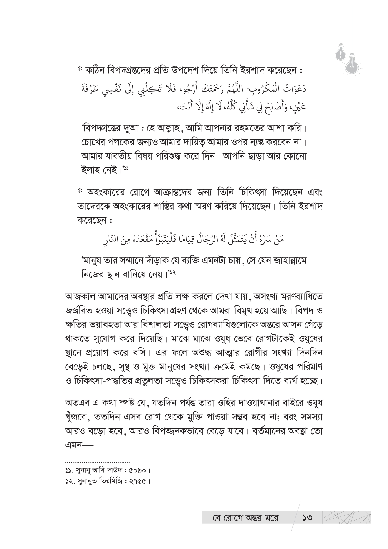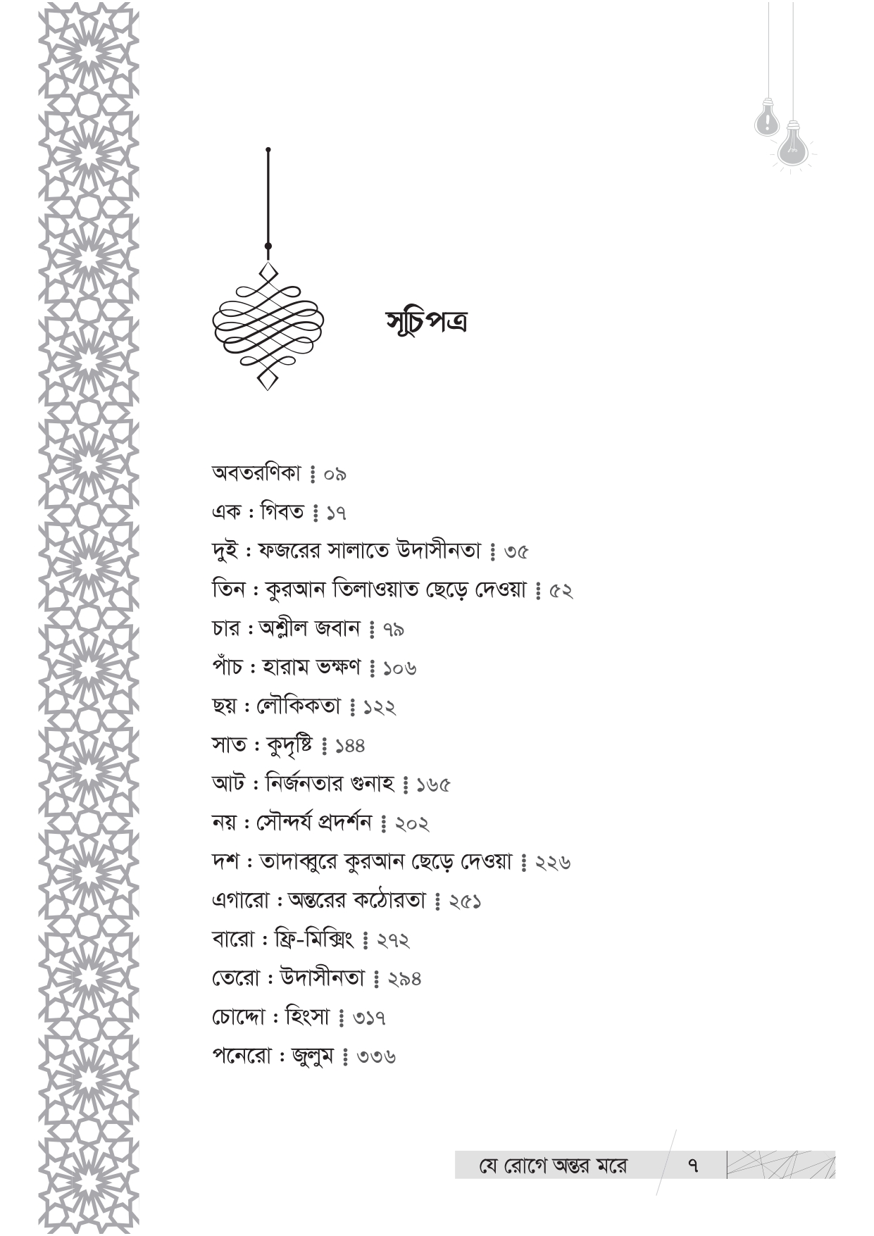 অতএব এ কথা স্পষ্ট যে, যতদিন পর্যন্ত ওহির দাওয়াখানার বাইরে ওষুধ খোঁজা হবে, ততদিন এসব রোগ থেকে মুক্তি পাওয়া সম্ভব হবে না; বরং সমস্যা আরও বড়ো হবে, আরও বিপজ্জনকভাবে বেড়ে যাবে।প্রিয় পাঠক, বক্ষ্যমাণ গ্রন্থে আপনি অন্তর-বিধ্বংসী এমনই ১৫টি মহা ব্যাধির স্বরূপ ও প্রতিকার সম্পর্কে জানতে পারবেন, যে ব্যাধিগুলোর ক্ষতি ও ভয়াবহতার ব্যাপারে আজকের অধিকাংশ মানুষই গাফিল বলা চলে।…