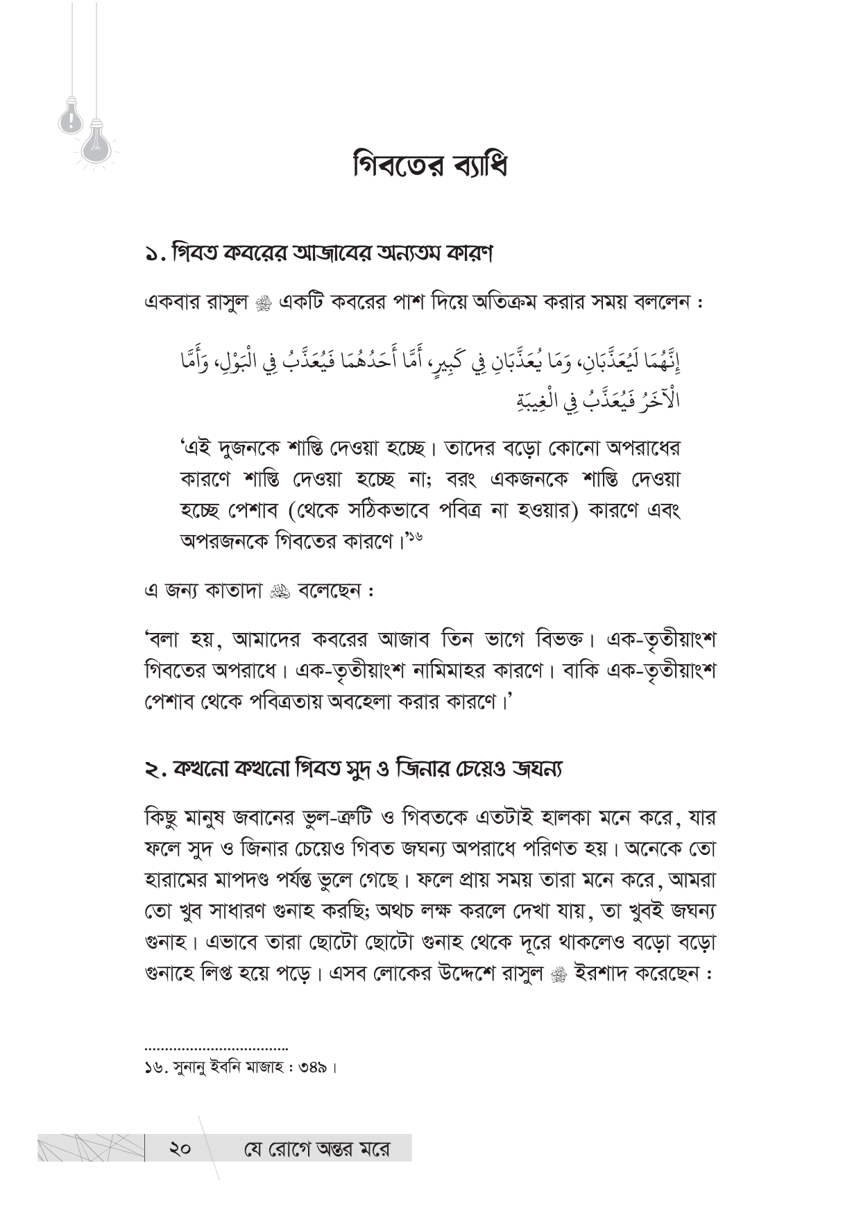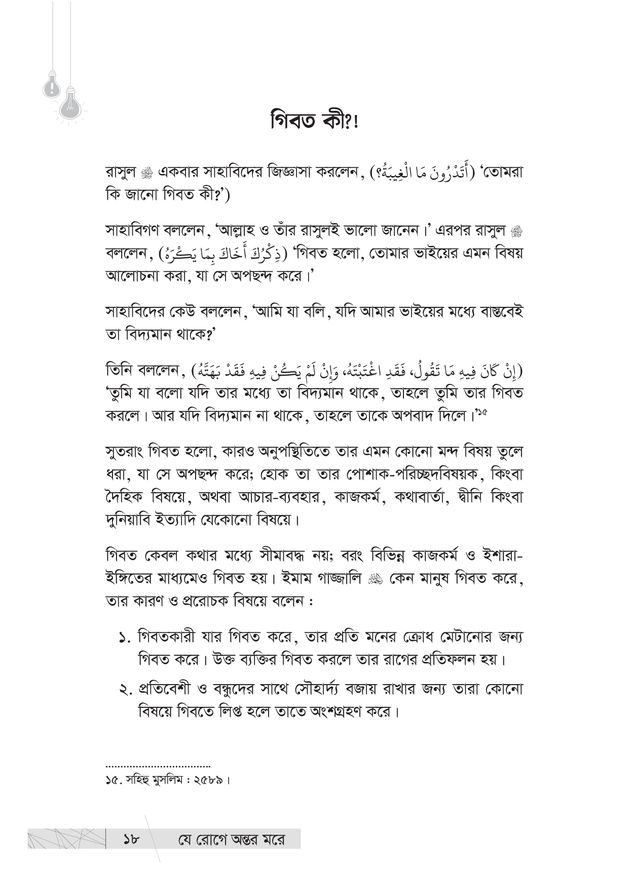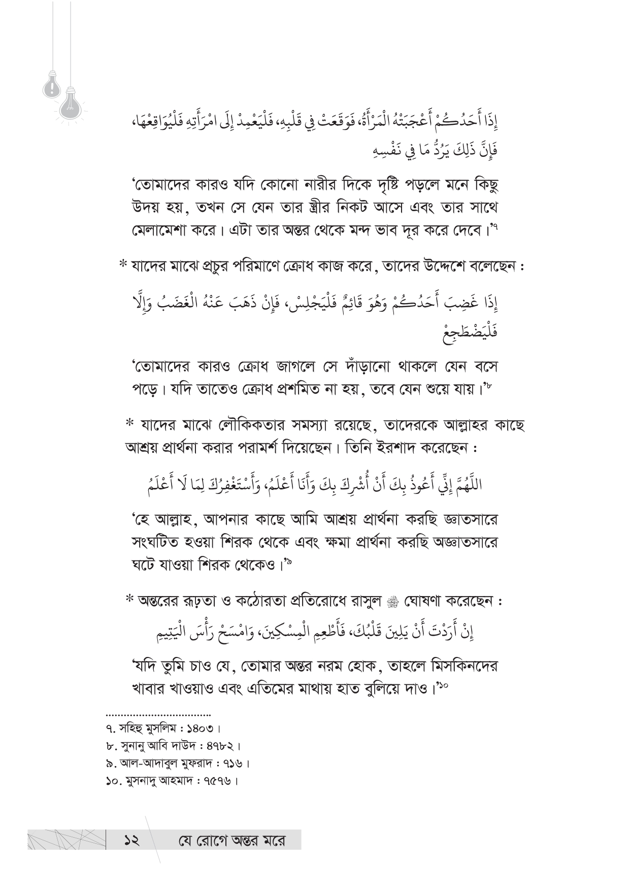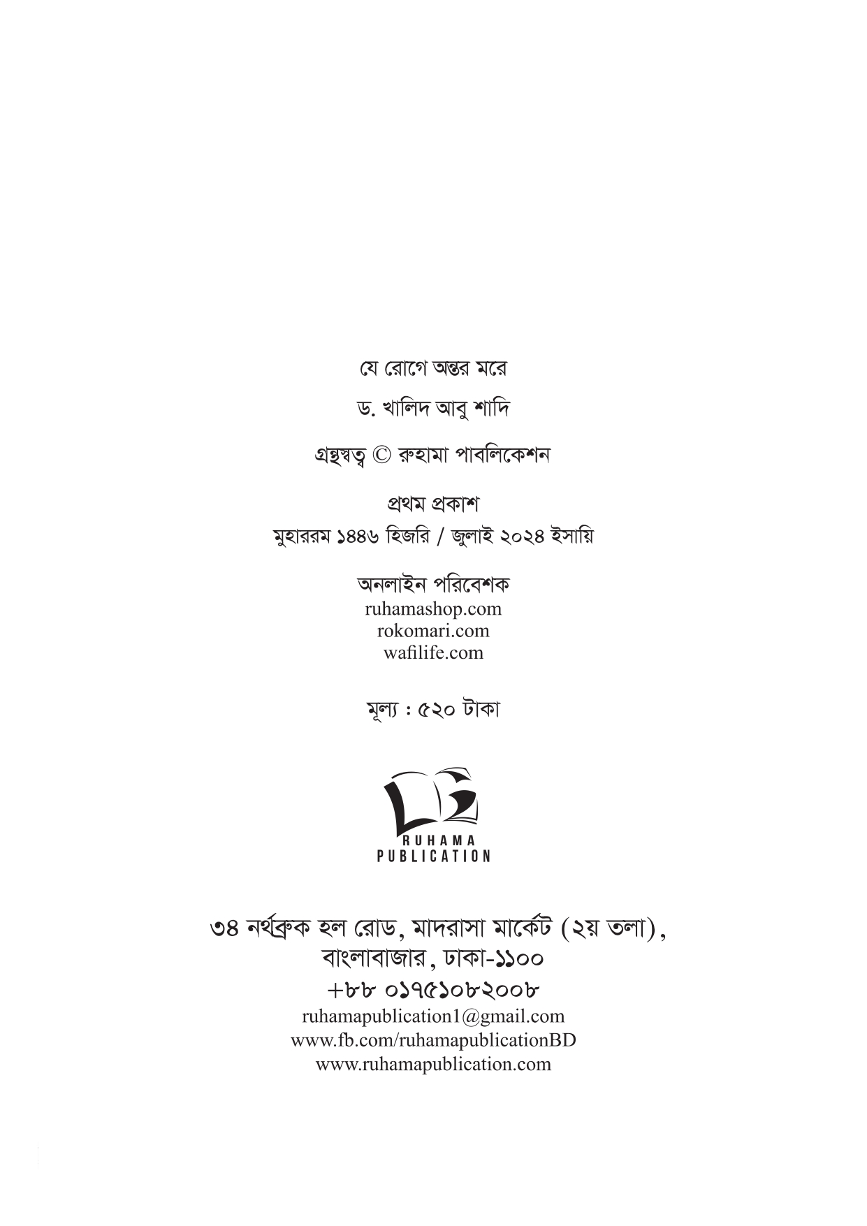 অতএব এ কথা স্পষ্ট যে, যতদিন পর্যন্ত ওহির দাওয়াখানার বাইরে ওষুধ খোঁজা হবে, ততদিন এসব রোগ থেকে মুক্তি পাওয়া সম্ভব হবে না; বরং সমস্যা আরও বড়ো হবে, আরও বিপজ্জনকভাবে বেড়ে যাবে।প্রিয় পাঠক, বক্ষ্যমাণ গ্রন্থে আপনি অন্তর-বিধ্বংসী এমনই ১৫টি মহা ব্যাধির স্বরূপ ও প্রতিকার সম্পর্কে জানতে পারবেন, যে ব্যাধিগুলোর ক্ষতি ও ভয়াবহতার ব্যাপারে আজকের অধিকাংশ মানুষই গাফিল বলা চলে।…