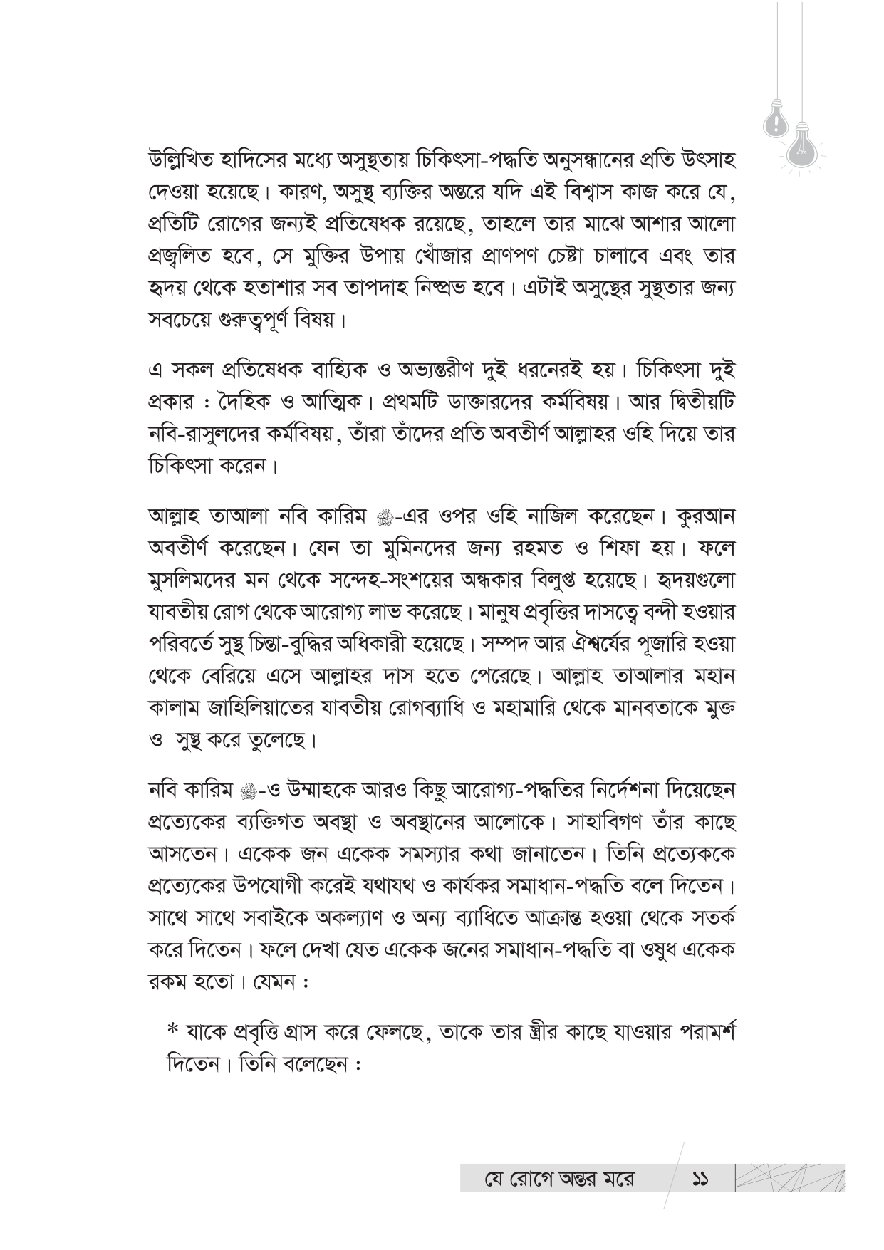 আমাদের অবস্থার প্রতি লক্ষ করলে দেখা যায়, অসংখ্য মরণব্যাধিতে জর্জরিত হওয়া সত্ত্বেও চিকিৎসা গ্রহণ থেকে আমরা বিমুখ হয়ে আছি। বিপদ ও ক্ষতির ভয়াবহতা আর বিশালতা সত্ত্বেও রোগব্যাধিগুলোকে অন্তরে আসন গেঁড়ে থাকতে সুযোগ করে দিয়েছি। মাঝে মাঝে ওষুধ ভেবে রোগটাকেই ওষুধের স্থানে প্রয়োগ করে বসি। এর ফলে অশুদ্ধ আত্মার রোগীর সংখ্যা দিনদিন বেড়েই চলছে, সুস্থ ও মুক্ত মানুষের সংখ্যা ক্রমেই কমছে। ওষুধের পরিমাণ ও চিকিৎসা-পদ্ধতির প্রতুলতা সত্ত্বেও চিকিৎসকরা চিকিৎসা দিতে ব্যর্থ হচ্ছে।