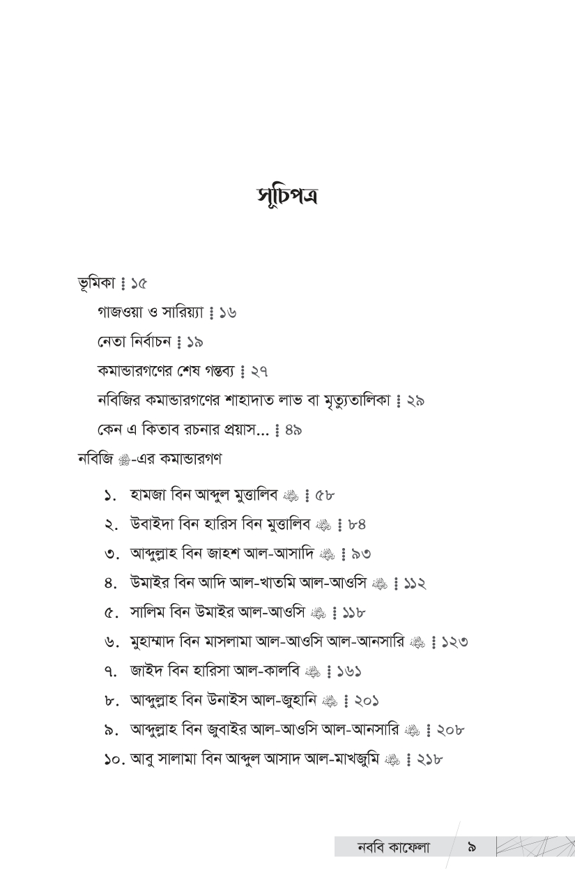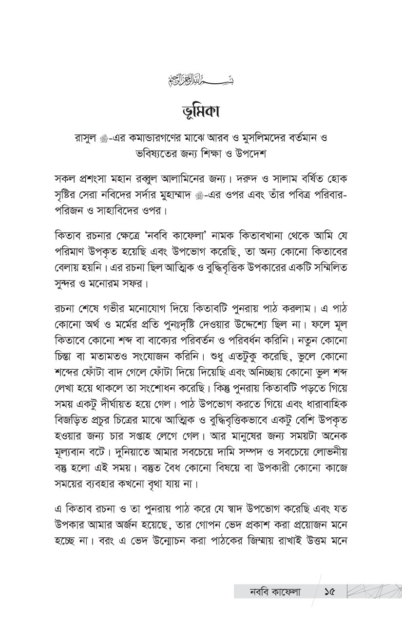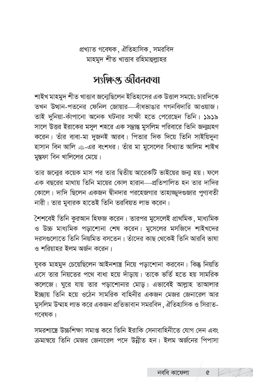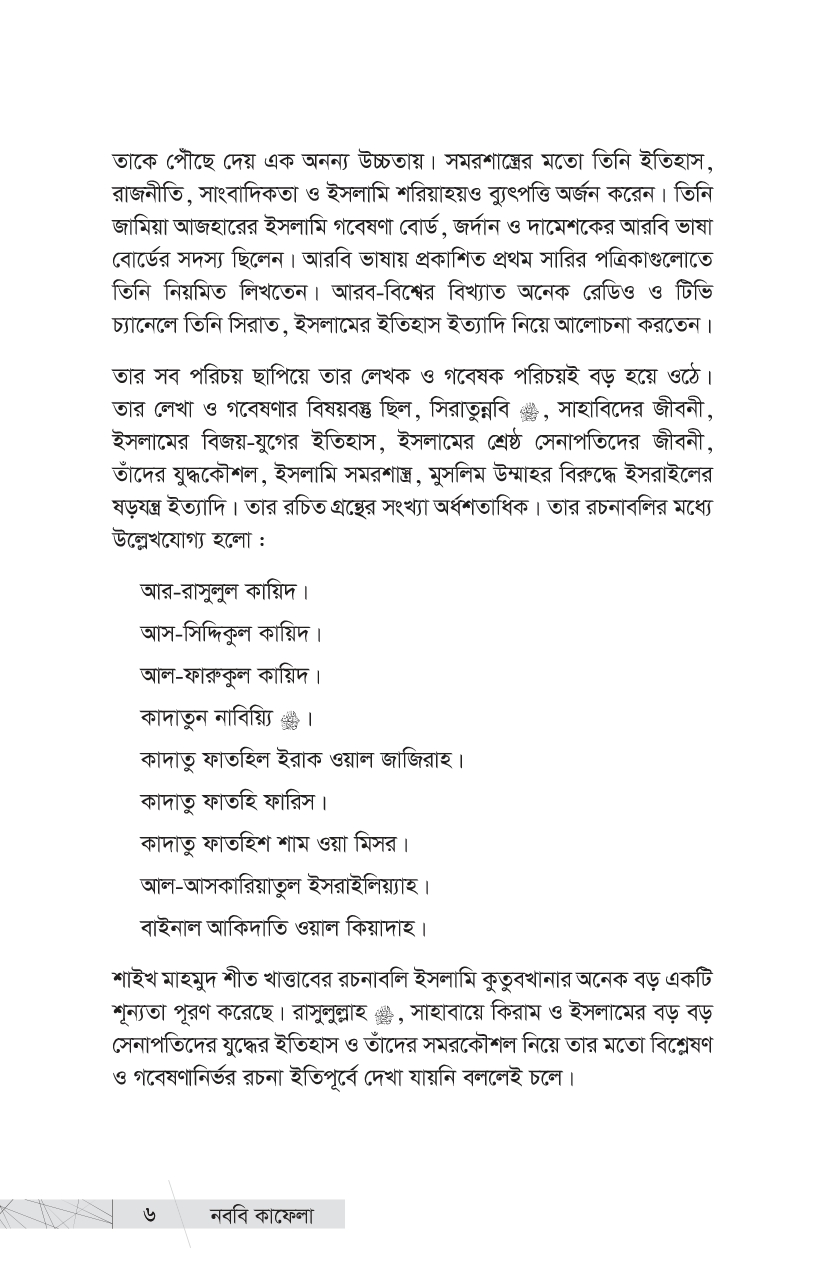 আমরা তো এই মহান লোকদেরই ভাগ্যবান বংশধর । এই ইতিহাস তো আমাদেরই পূর্বপুরুষদের ইতিহাস । আমাদের গৌরবময় ইতিহাসের এই আলো-ঝলমলে পাতাগুলো কি আমরা উলটাব না? প্রিয় পাঠক, ইতিহাসের এই আলোকিত দৃশ্যগুলো নিয়েই আপনাদের প্রিয় প্রকাশনী রুহামার নতুন আকর্ষণ, প্রখ্যাত ঐতিহাসিক, সমরবিদ ও সিরাত-গবেষক শাইখ মাহমুদ শীত খাত্তাবের এক অমর অজর রচনা ‘কাদাতুন নাবিয়্যি এ’—’নববি কাফেলা’ । গোটা ইসলামি কুতুবখানার দিকে হাত বাড়ালে এমন সমৃদ্ধ ও গবেষণামূলক গ্রন্থ খুব বেশি দেখা যায় না । শাইখ খাত্তাবের সামরিক প্রতিভা, গবেষকসুলভ অন্তর্দৃষ্টি ও বিপুল অধ্যয়নের ছাপ পাওয়া যায় বইটির পাতায় পাতায় । আল-মাদরাসাতুন নাবাবিয়াহ থেকে উত্তীর্ণ সামরিক ও প্রশাসনিক সাহাবি নেতৃবৃন্দের ঐতিহাসিক কর্মগাথার রীতিমতো একটি বিশ্বকোষ এই বই । রাসুলুল্লাহ -এর পবিত্র হাতে গড়া ৩১ জন মহান সামরিক কমাণ্ডার এবং প্রশাসনিক নেতৃবৃন্দের জীবন, কর্ম ও অবদান নিয়ে ধাপে ধাপে নির্মাণ করা হয়েছে এই মূল্যবান গ্রন্থটি । আসুন, আমরা আমাদের এই মহান পূর্বপুরুষদের গৌরবময় ইতিহাস সম্পর্কে জানি, কদম রাখি তাঁদের মতোই সাফল্যলাভের পথে—জীবনের অন্তিম মুহূর্তেও যে পথের পথিকদের মুখে উচ্চারিত হয়, ‘কাবার রবের শপথ’ আমি সফলকাম হয়েছি!’…