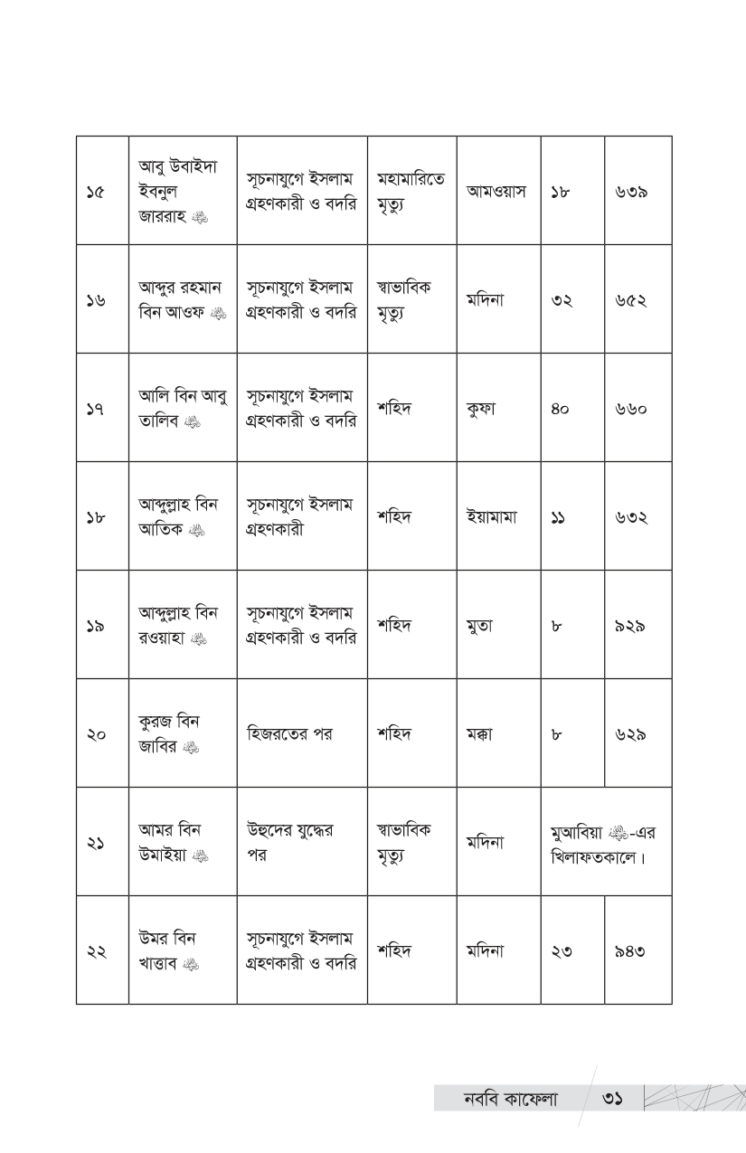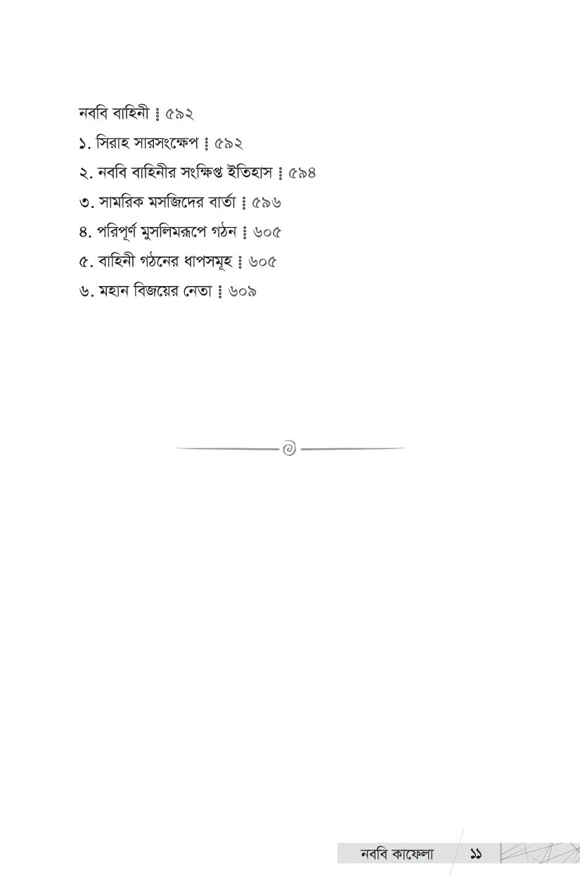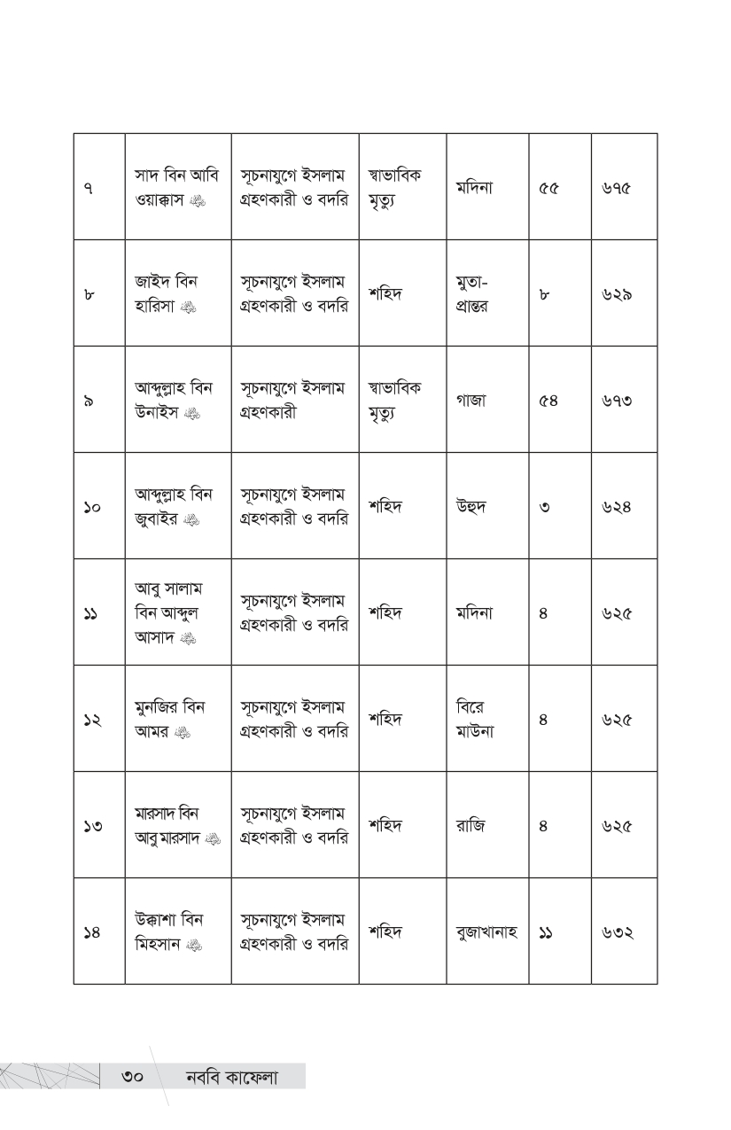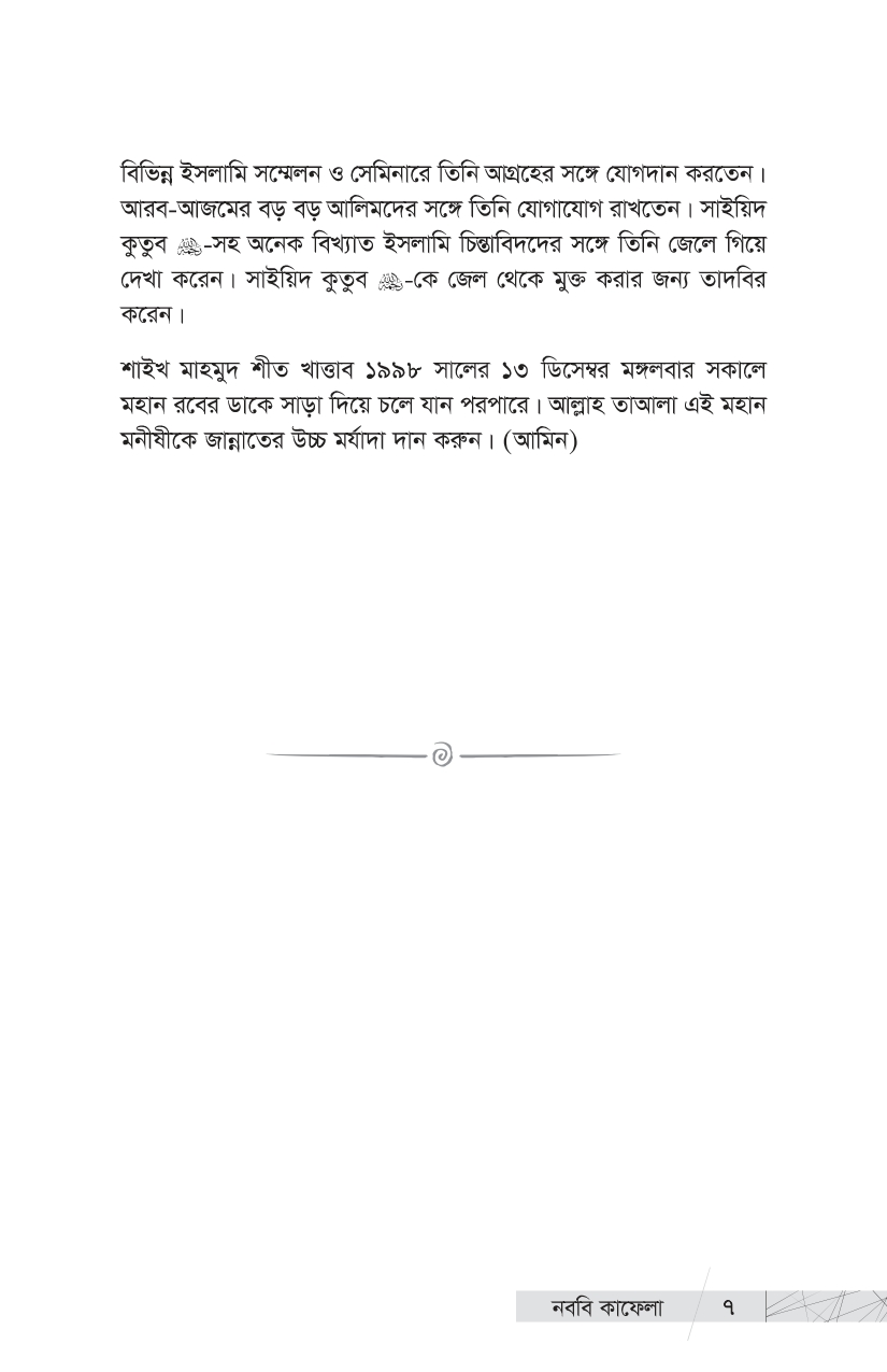 আমরা তো এই মহান লোকদেরই ভাগ্যবান বংশধর । এই ইতিহাস তো আমাদেরই পূর্বপুরুষদের ইতিহাস । আমাদের গৌরবময় ইতিহাসের এই আলো-ঝলমলে পাতাগুলো কি আমরা উলটাব না? প্রিয় পাঠক, ইতিহাসের এই আলোকিত দৃশ্যগুলো নিয়েই আপনাদের প্রিয় প্রকাশনী রুহামার নতুন আকর্ষণ, প্রখ্যাত ঐতিহাসিক, সমরবিদ ও সিরাত-গবেষক শাইখ মাহমুদ শীত খাত্তাবের এক অমর অজর রচনা ‘কাদাতুন নাবিয়্যি এ’—’নববি কাফেলা’ । গোটা ইসলামি কুতুবখানার দিকে হাত বাড়ালে এমন সমৃদ্ধ ও গবেষণামূলক গ্রন্থ খুব বেশি দেখা যায় না । শাইখ খাত্তাবের সামরিক প্রতিভা, গবেষকসুলভ অন্তর্দৃষ্টি ও বিপুল অধ্যয়নের ছাপ পাওয়া যায় বইটির পাতায় পাতায় । আল-মাদরাসাতুন নাবাবিয়াহ থেকে উত্তীর্ণ সামরিক ও প্রশাসনিক সাহাবি নেতৃবৃন্দের ঐতিহাসিক কর্মগাথার রীতিমতো একটি বিশ্বকোষ এই বই । রাসুলুল্লাহ -এর পবিত্র হাতে গড়া ৩১ জন মহান সামরিক কমাণ্ডার এবং প্রশাসনিক নেতৃবৃন্দের জীবন, কর্ম ও অবদান নিয়ে ধাপে ধাপে নির্মাণ করা হয়েছে এই মূল্যবান গ্রন্থটি । আসুন, আমরা আমাদের এই মহান পূর্বপুরুষদের গৌরবময় ইতিহাস সম্পর্কে জানি, কদম রাখি তাঁদের মতোই সাফল্যলাভের পথে—জীবনের অন্তিম মুহূর্তেও যে পথের পথিকদের মুখে উচ্চারিত হয়, ‘কাবার রবের শপথ’ আমি সফলকাম হয়েছি!’…