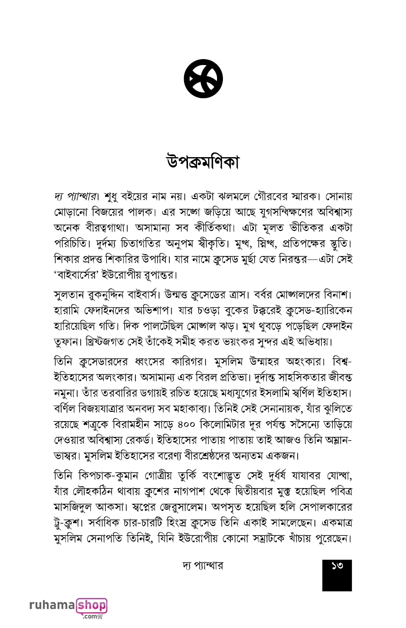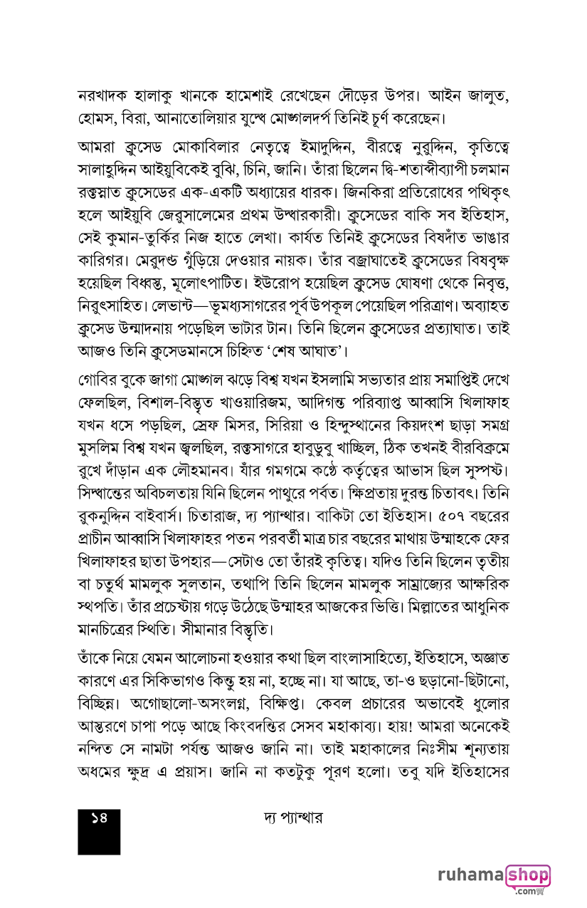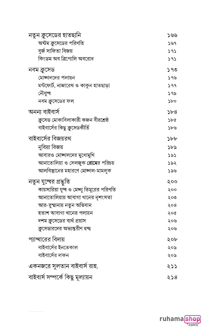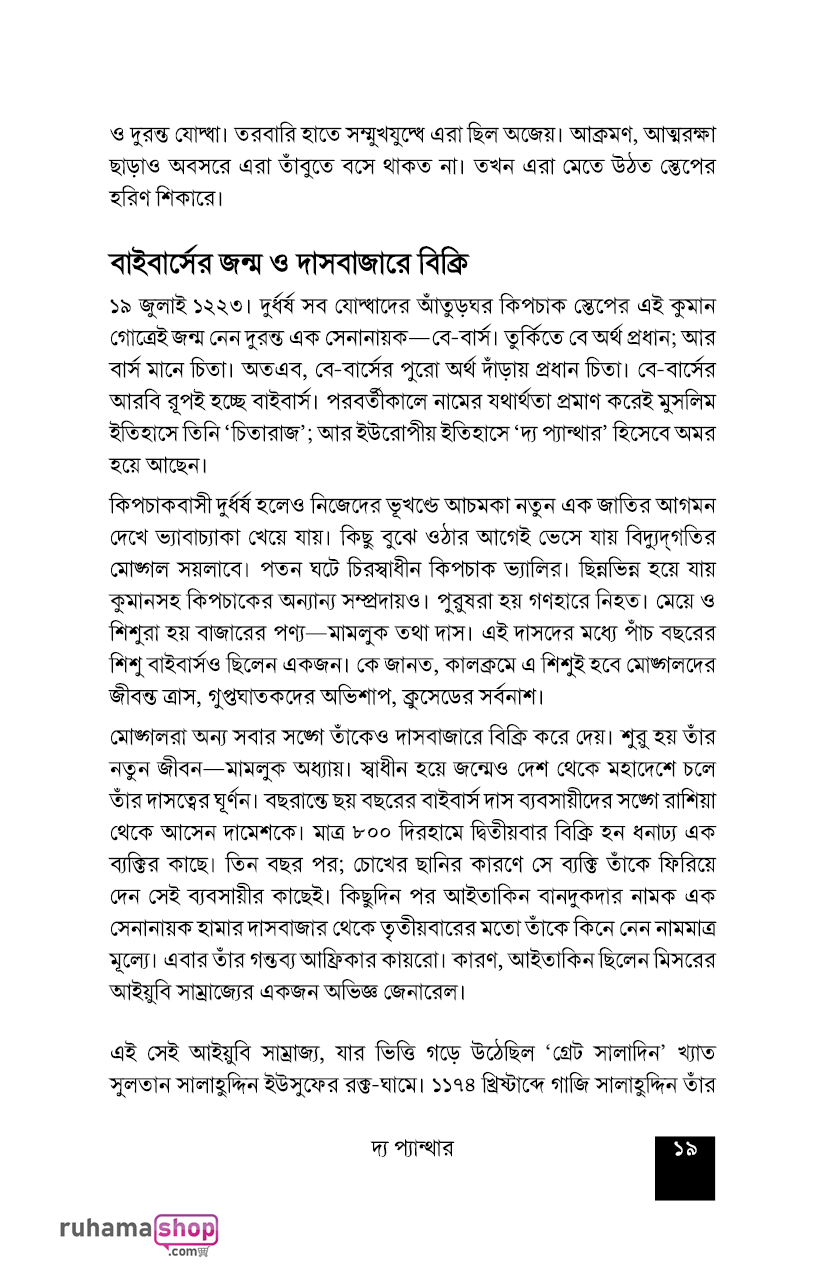 লেখক বইটিতে সুলতান রুকনুদ্দিন বাইবার্সের বর্ণাঢ্য জীবন নিয়ে উপন্যাস লিখেননি; কিন্তু পাঠক এতে পেয়ে যাবেন ঔপন্যাসিক আবহ। গা শিহরানো ঘটনামালা, শ্বাসরুদ্ধকর লড়াই, চেতনা জাগানো দৃশ্যাবলীর ভেতর দিয়ে প্রতিশ্রুতিশীল এই লেখক তুলে ধরেছেন ইতিহাসের সেই উত্তাল অধ্যায়কে